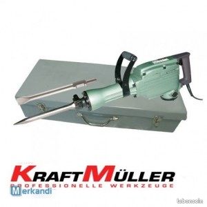 Marteau piqueur électrique 2400W avec mallette à roulettes. Poignées montées sur amortisseurs, boîtier moteur à double isolation, bouton de verrouillage, taux d'impact 1400bpm, énergie d'impact 55J. Boîtier principal en aluminium très épais et résistant.